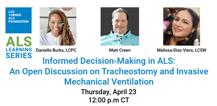 Join us this Thursday, April 23, at 12 p.m. CT for our upcoming ALS Learning Series webinar: Informed Decision-Making in ALS. This expert-led discussion focuses on the medical and emotional considerations surrounding tracheostomy and invasive mechanical ventilation.